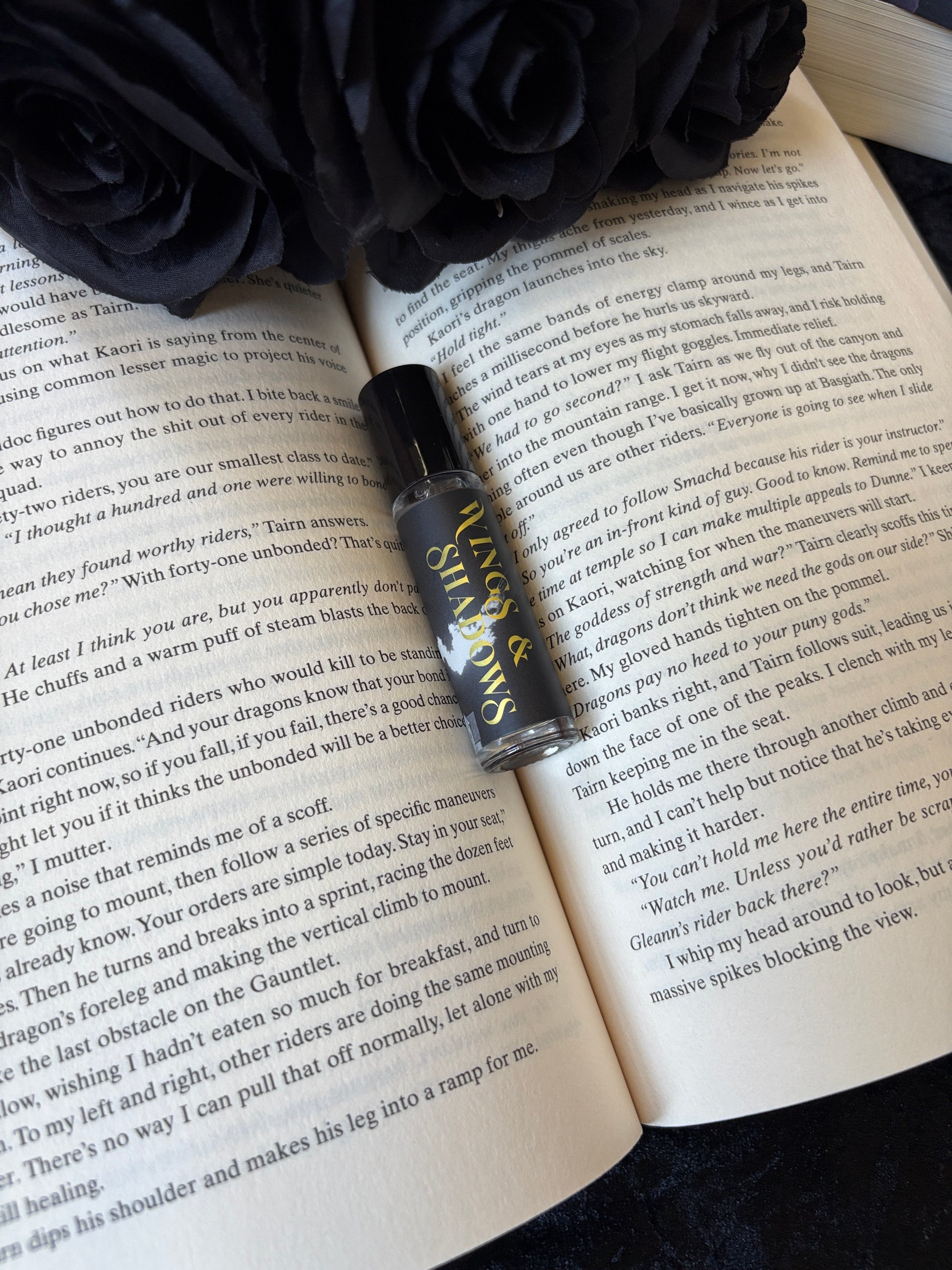 Power hums in the air - ancient, electric, and laced with danger. Wings and Shadows is a fragrance born from fire-bonded hearts and skies ruled by dragons. Inspired by a story of enemies who become everything, of war-torn magic academies, and of survival written in shadows, lightening and storms, this scent is made for those who rise when the world tries to break them.